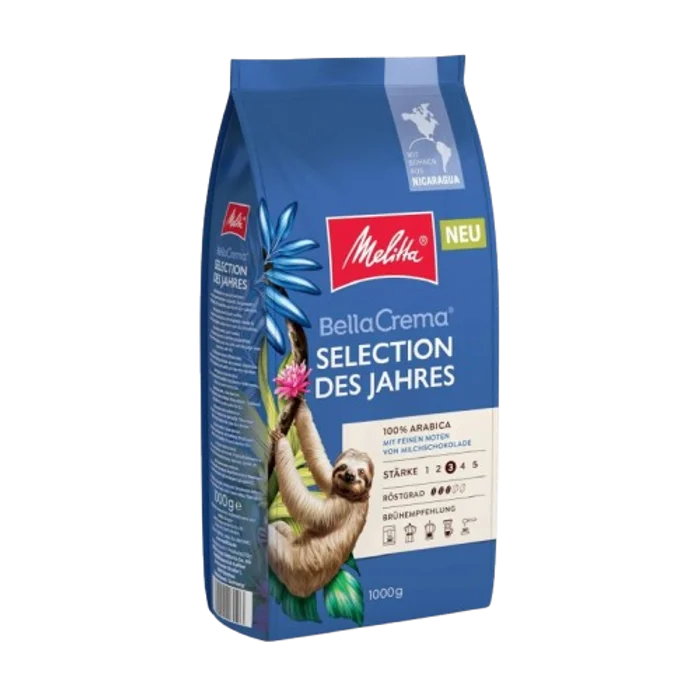 Melitta BellaCrema Selection Des Jahres este o cafea boabe premium 100% Arabica, parte a seriei „Selecția Anului” care aduce în fiecare an o origine și un profil aromatic deosebit, oferind o experiență unică de degustare. În această ediție, boabele provin din regiuni cafetiere atent alese precum Nicaragua sau Zambia, ceea ce conferă cafelei o aromă fructată, dulce și fin echilibrată.